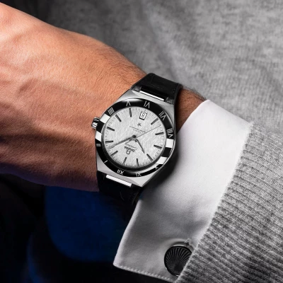 - Black Leather Strap : Luxurious crocodile – embossed texture. secured by a stainless steel deployment clasp for a refined fit.